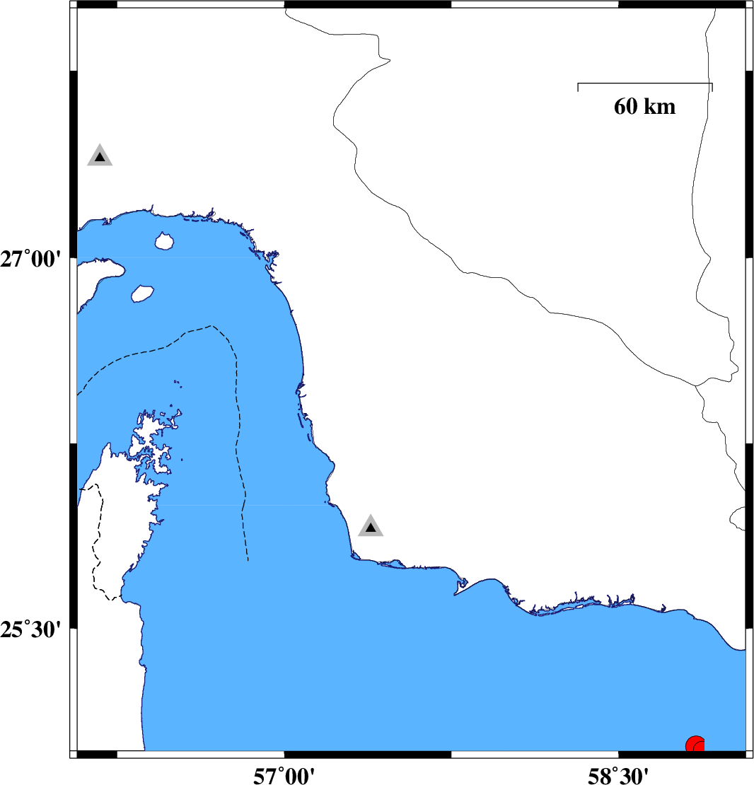 2013/05/11 03:09:48.1 07:39:48.1 26.5257.8715 Ms:5.7 Hormozgan Province, 99 km North-East of Jask