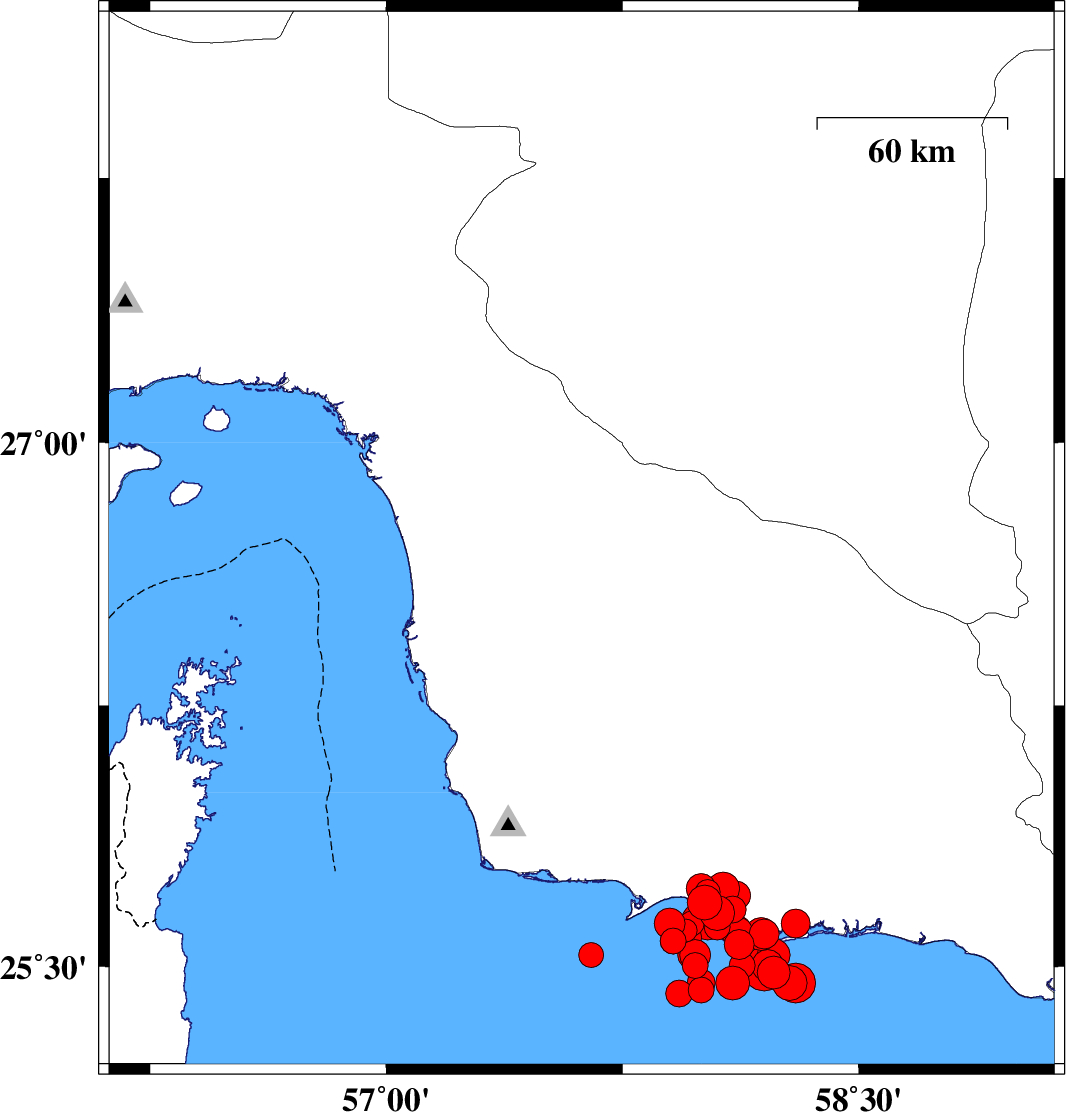 2013/05/11 22:28:08.5 02:58:08.5 26.6957.4714 ML:4.4 Hormozgan Province, 80 km South of Manujan