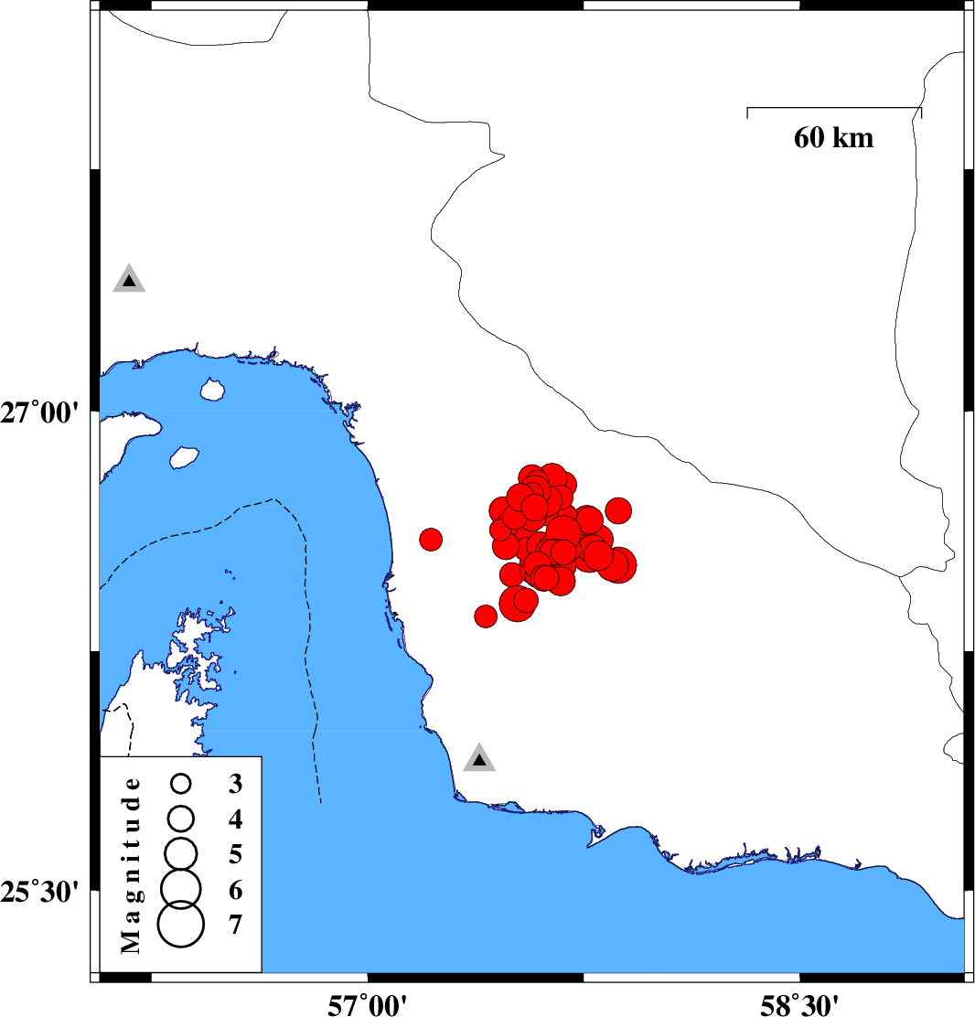 2013/05/11 22:23:05.8 02:53:05.8 26.7557.5814 ML:5 Hormozgan Province, 74 km South of Manujan