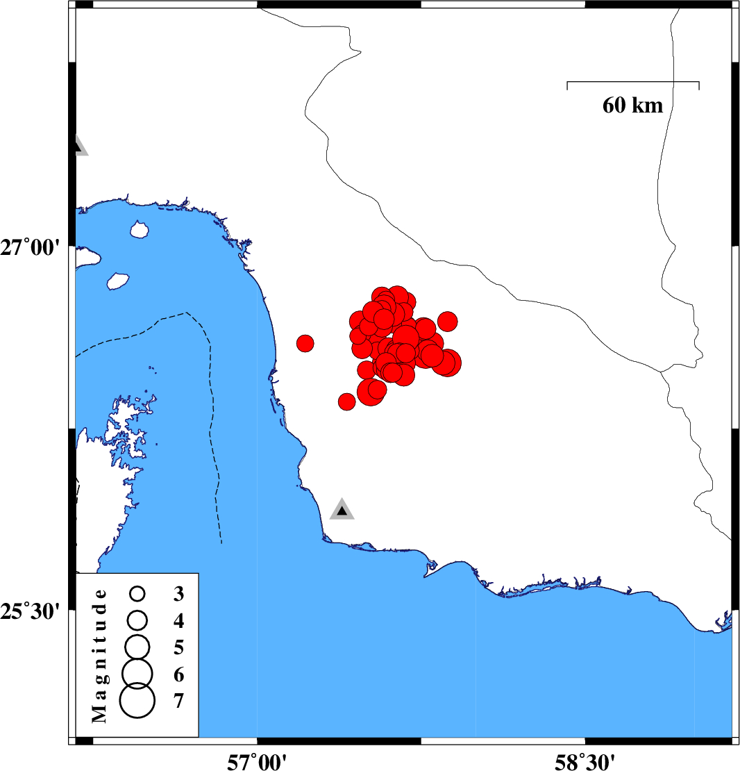 2013/05/11 22:23:05.8 02:53:05.8 26.7557.5814 ML:5 Hormozgan Province, 74 km South of Manujan