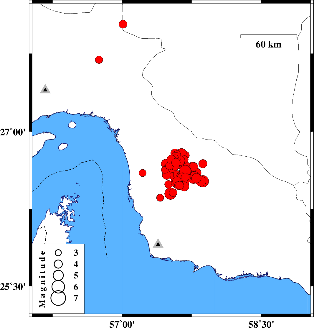 2013/05/11 22:23:05.8 02:53:05.8 26.7557.5814 ML:5 Hormozgan Province, 74 km South of Manujan