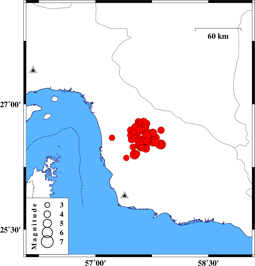 2013/05/11 22:23:05.8 02:53:05.8 26.7557.5814 ML:5 Hormozgan Province, 74 km South of Manujan
