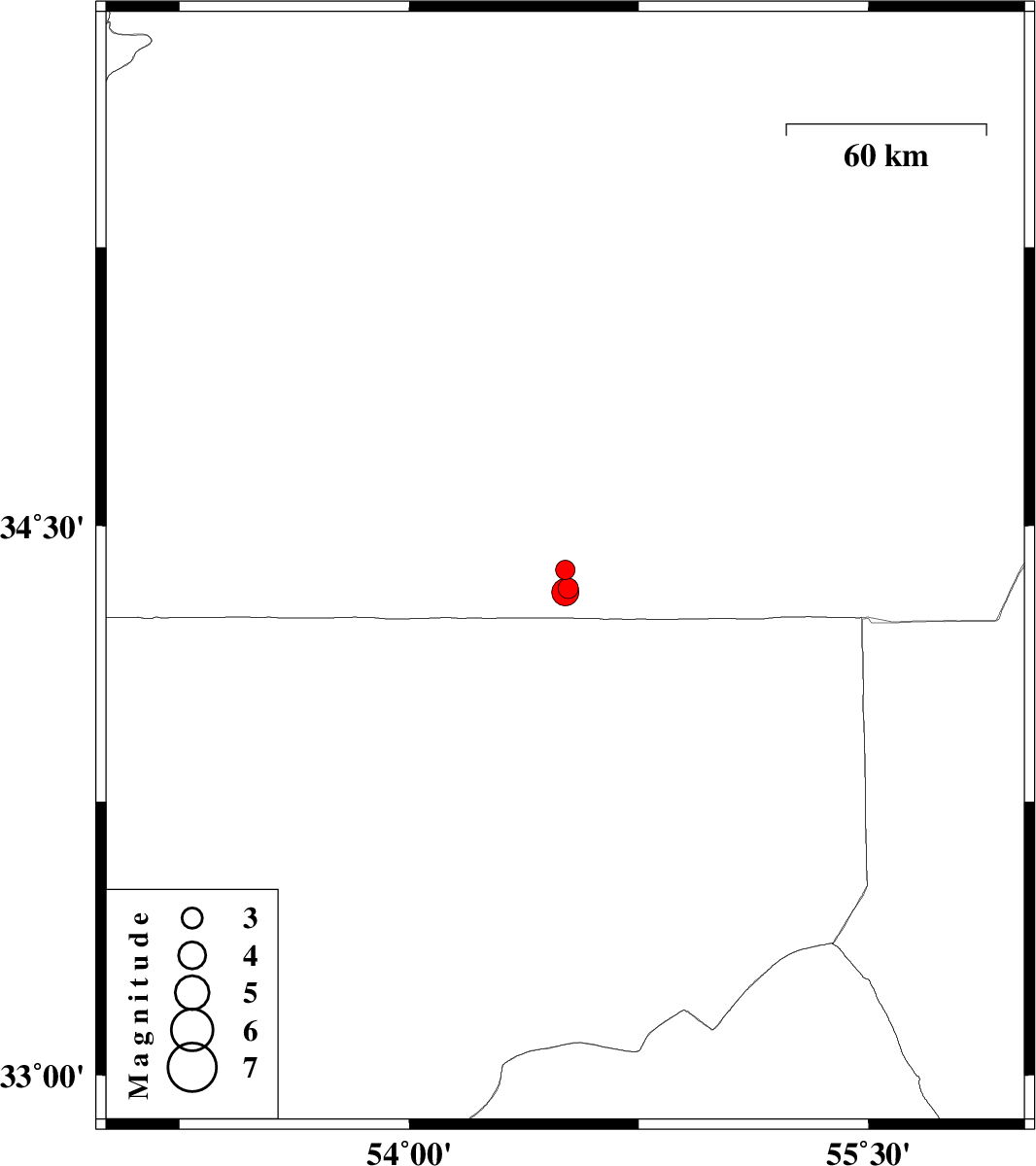 | 2013/05/07 | 20:23:00.3 | 00:53:00.3 | 34.32 | 54.51 | 14 | ML:4 | Semnan Province, 206 km South-East of Damghan |