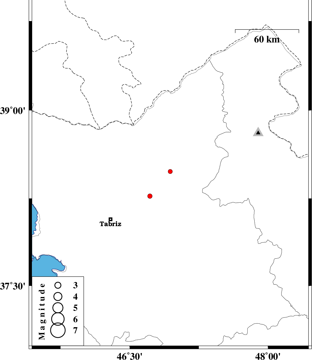 | 2013/05/17 | 01:55:23.3 | 06:25:23.3 | 38.27 | 46.72 | 15 | ML:2.2 | Azarbaijan Sharghi Province, 34 km West of Haris |