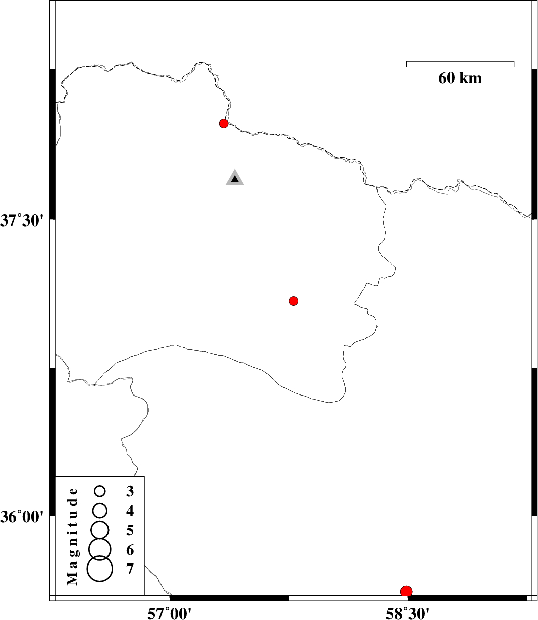 | 2013/05/20 | 15:32:20.5 | 20:02:20.5 | 37.98 | 57.34 | 6 | ML:2.6 | Khorasan(north) Province, 57 km North of Bojnurd | ||