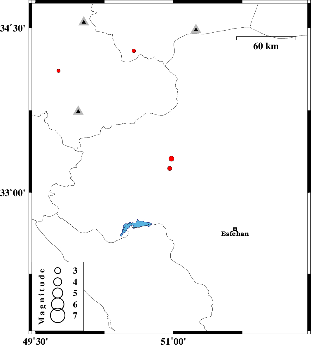 | 2013/05/20 | 09:46:55.1 | 14:16:55.1 | 34.11 | 49.75 | 27 | ML:1.7 | Markazi Province, 6 km Arak |