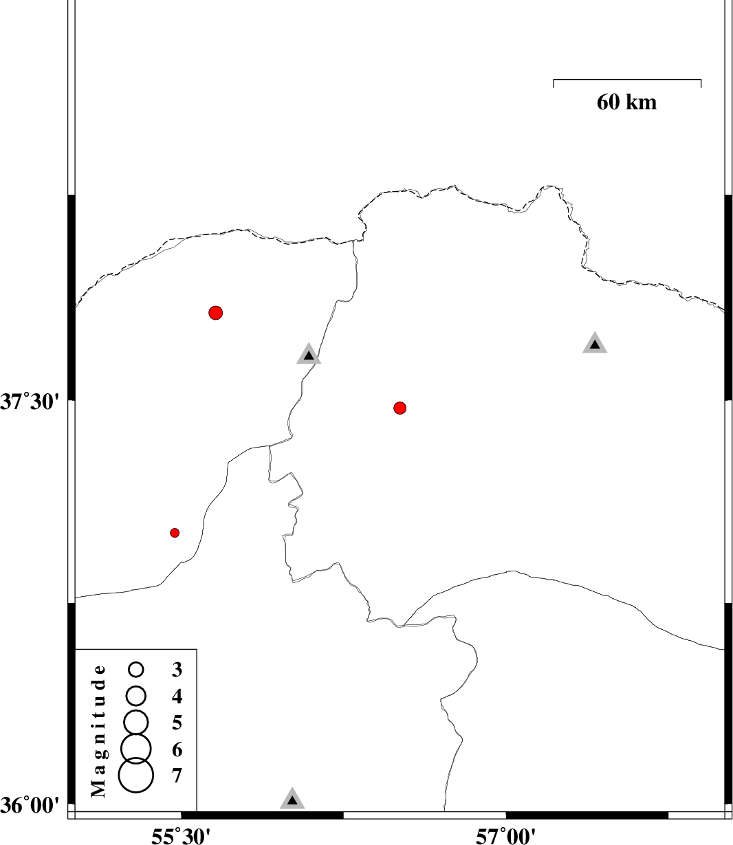 | 2013/06/04 | 22:33:02.0 | 03:03:02.0 | 37.82 | 55.66 | 17 | ML:2.8 | Golestan Province, 51 km North-East of Kalaleh | ||