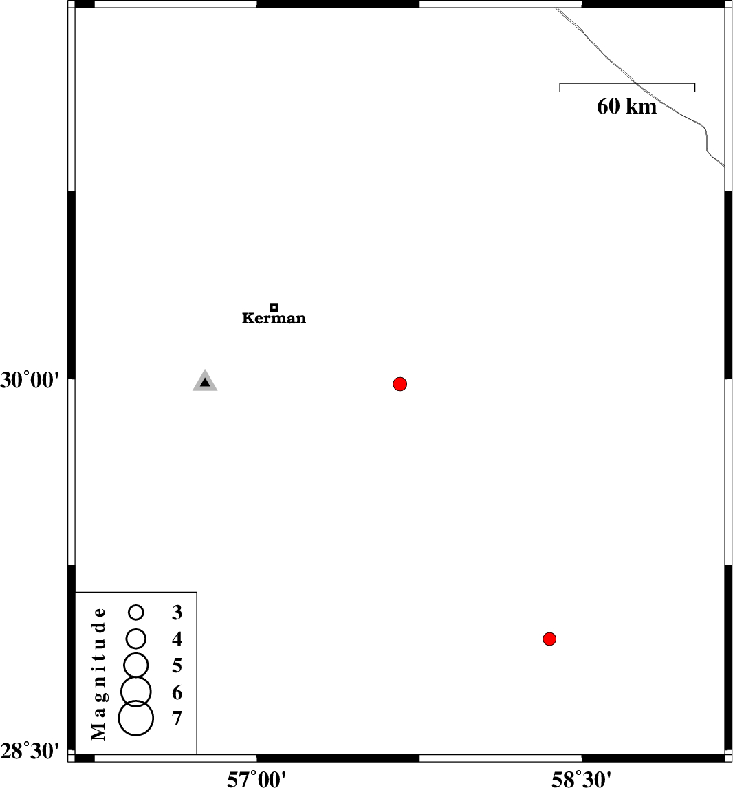 | 2013/06/01 | 02:02:27.7 | 06:32:27.7 | 28.95 | 58.35 | 14 | ML:2.7 | Kerman Province, 18 km South of Bam |