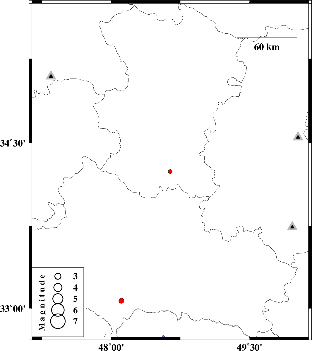 | 2013/06/04 | 12:58:21.3 | 17:28:21.3 | 33.07 | 48.11 | 14 | ML:2.5 | Lorestan Province, 38 km East of Pol-e dokhtar |