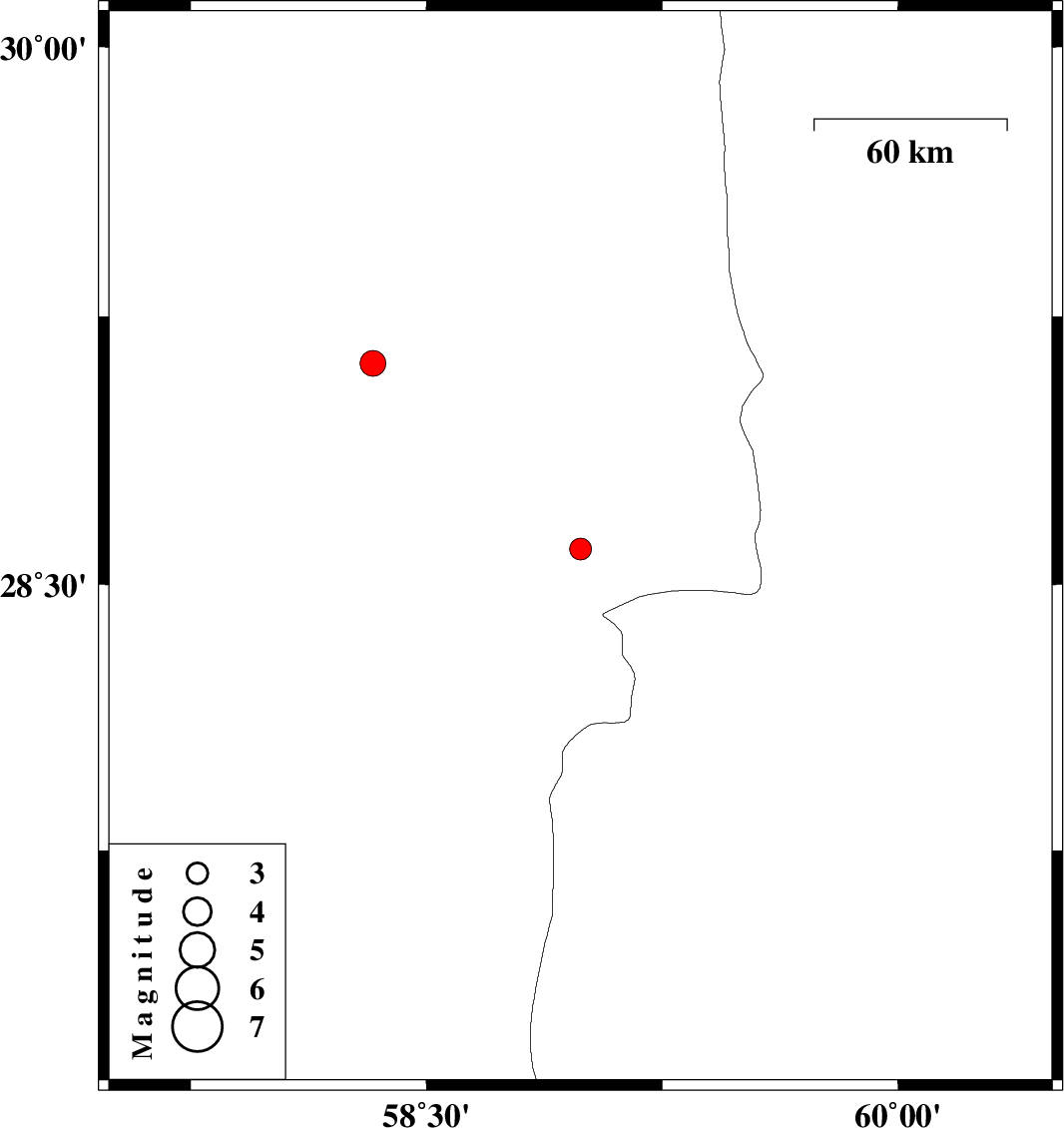 | 2013/06/18 | 21:00:56.3 | 01:30:56.3 | 28.6 | 58.99 | 14 | ML:3.1 | Kerman Province, 83 km South-East of Bam | ||