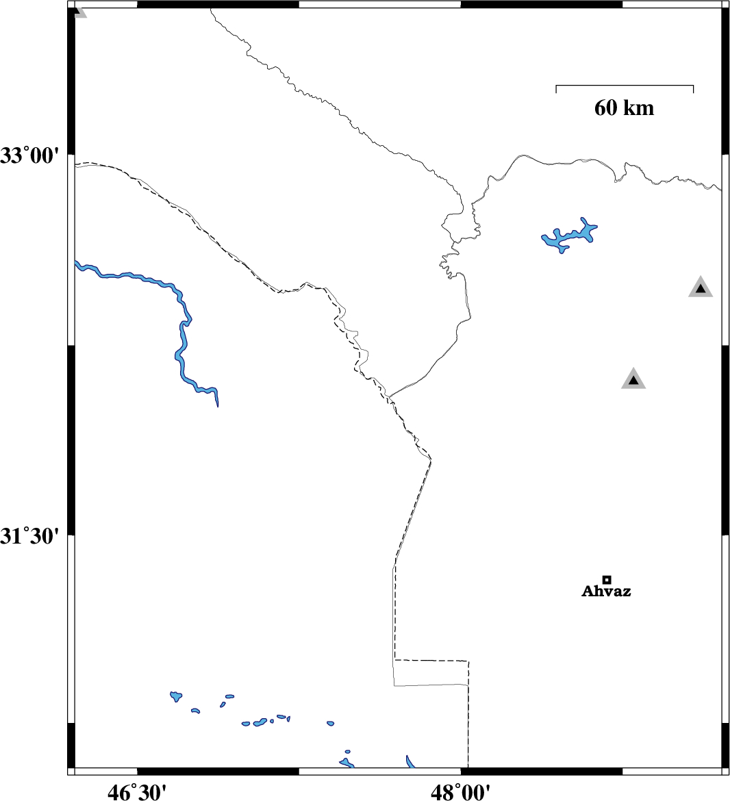 | 2013/07/18 | 00:42:41.8 | 05:12:41.8 | 32.07 | 47.71 | 14 | ML:3.3 | Khoozestan Province, 53 km South-West of Shush | ||