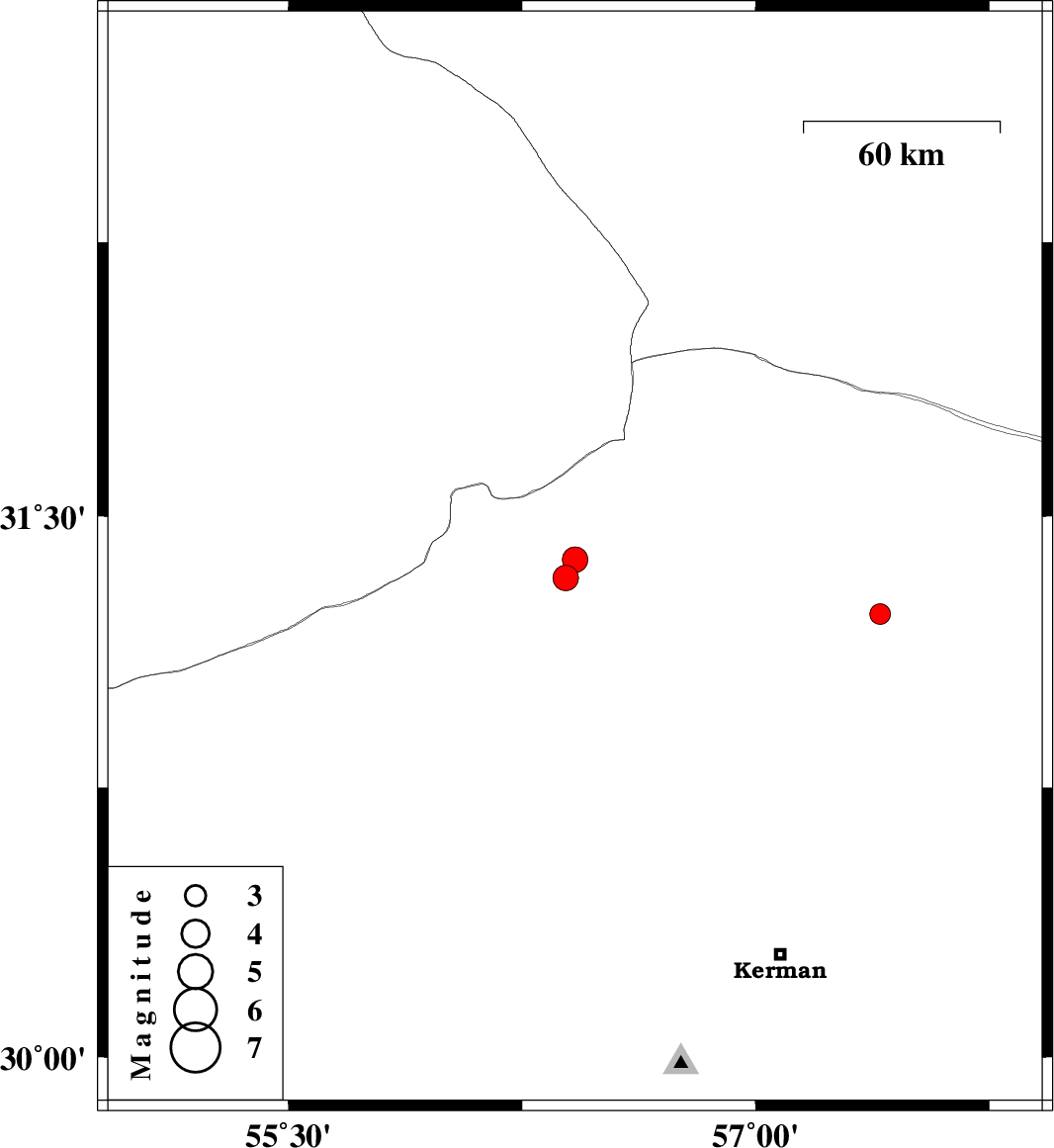| 2013/07/19 | 23:26:42.1 | 03:56:42.1 | 31.33 | 56.39 | 15 | ML:3.6 | Kerman Province, 41 km West of Ravar | ||
