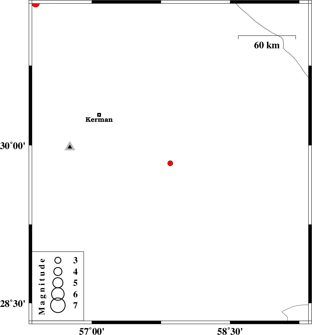 | 2013/07/19 | 23:26:42.1 | 03:56:42.1 | 31.33 | 56.39 | 15 | ML:3.6 | Kerman Province, 41 km West of Ravar |