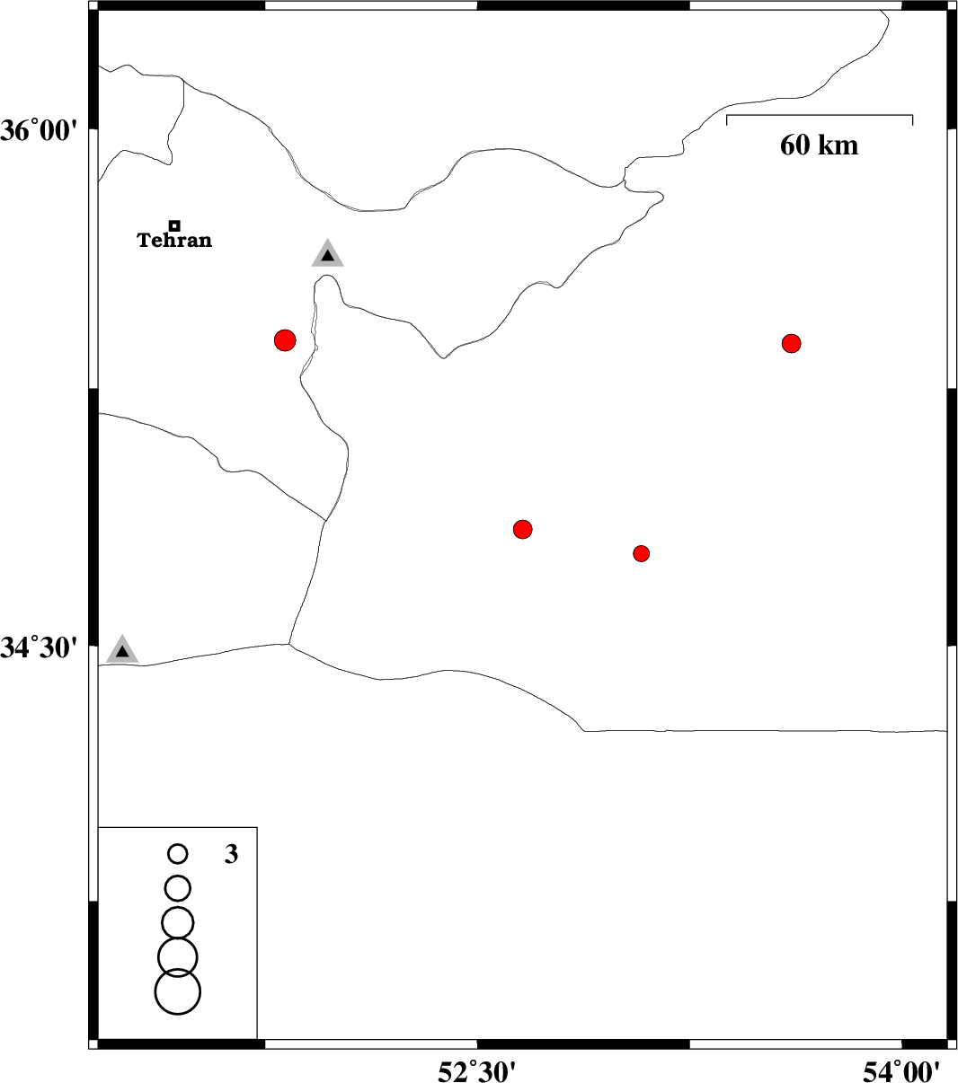 | 2013/08/18 | 02:43:01.7 | 07:13:01.7 | 35.38 | 53.61 | 26 | ML:3 | Semnan Province, 28 km South-East of Semnan |