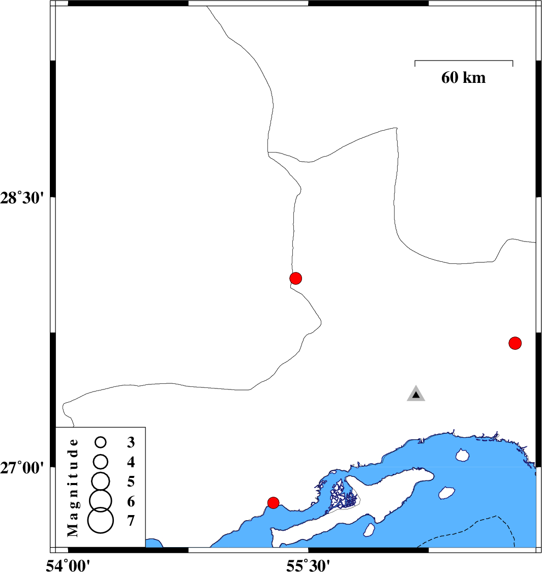 | 2013/08/27 | 17:05:07.5 | 21:35:07.5 | 28.05 | 55.42 | 18 | ML:3.4 | Hormozgan Province, 56 km South-West of Hajiabad | ||