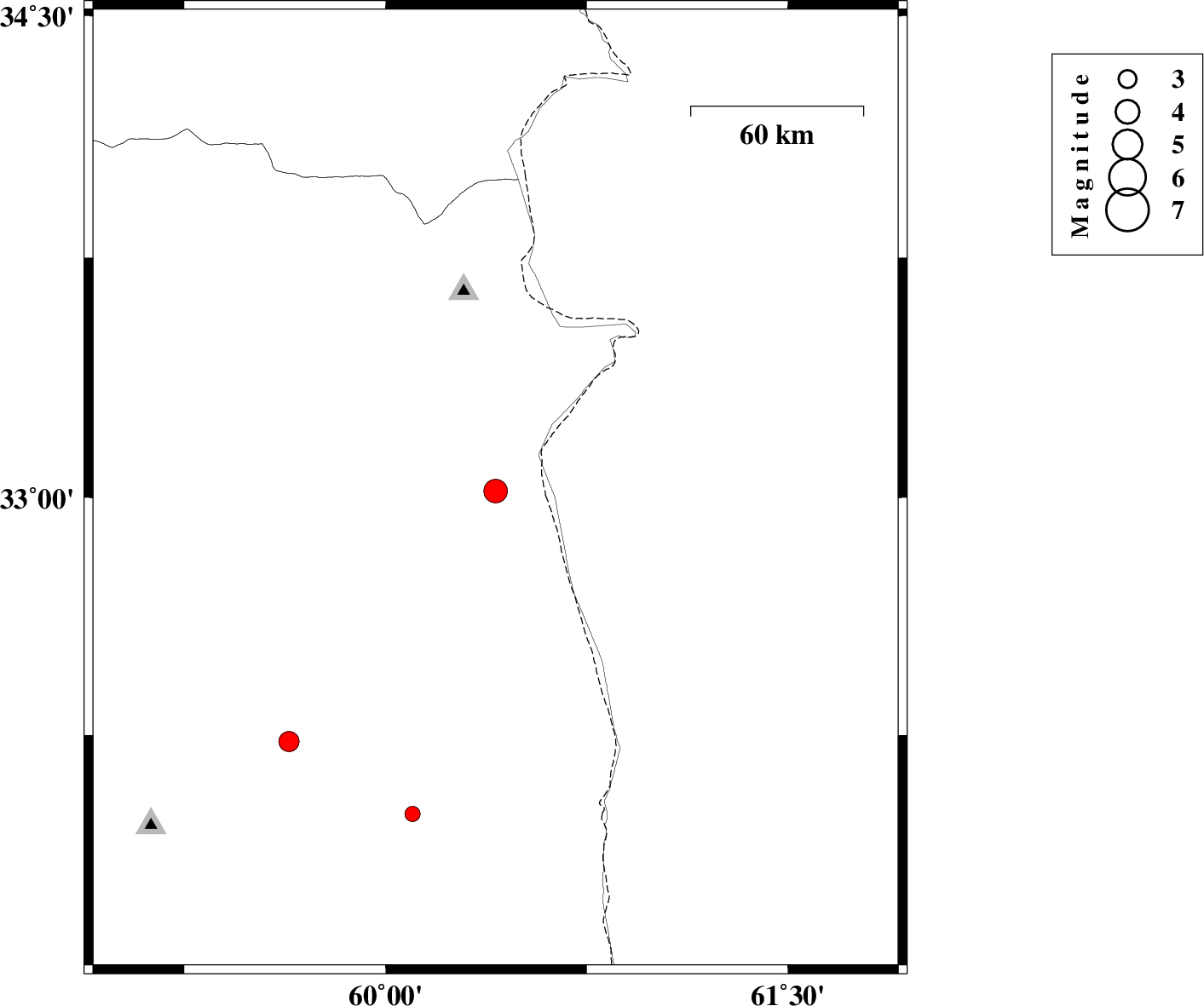 | 2013/08/27 | 01:22:16.1 | 05:52:16.1 | 32 | 60.1 | 17 | ML:2.6 | Khorasan(south) Province, 52 km North of Nehbandan | ||