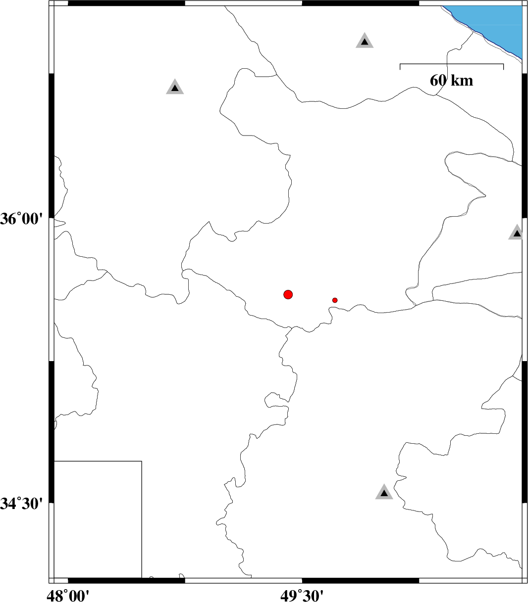 | 2013/08/26 | 21:34:30.6 | 02:04:30.6 | 35.57 | 49.71 | 46 | ML:1.4 | Ghazvin Province, 55 km South of Takestan |