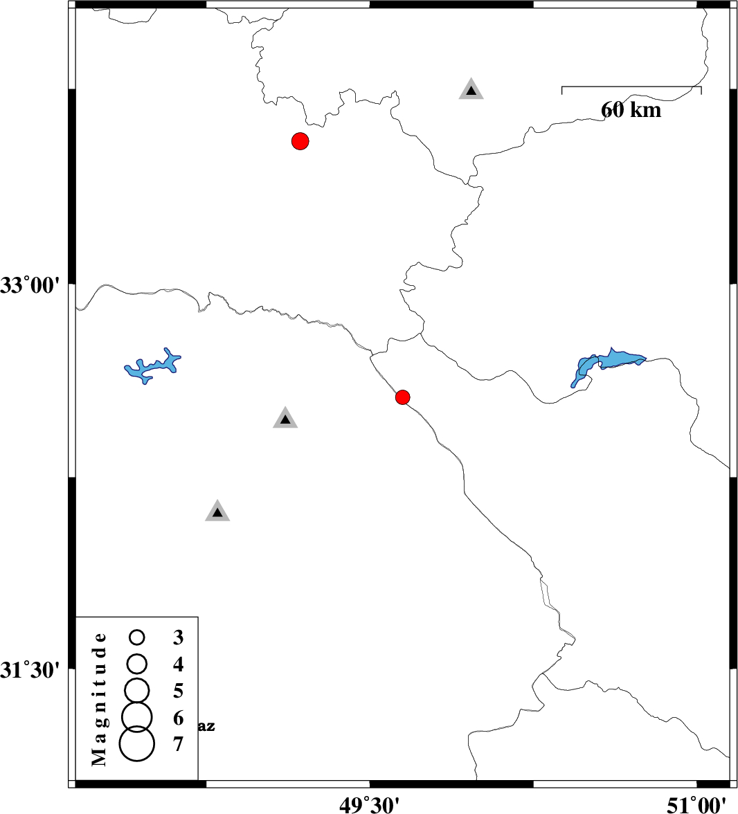 | 2013/09/05 | 20:52:02.7 | 01:22:02.7 | 32.56 | 49.65 | 16 | ML:2.9 | Chaharmahal Bakhtiari Province, 46 km West of Chelgard | ||