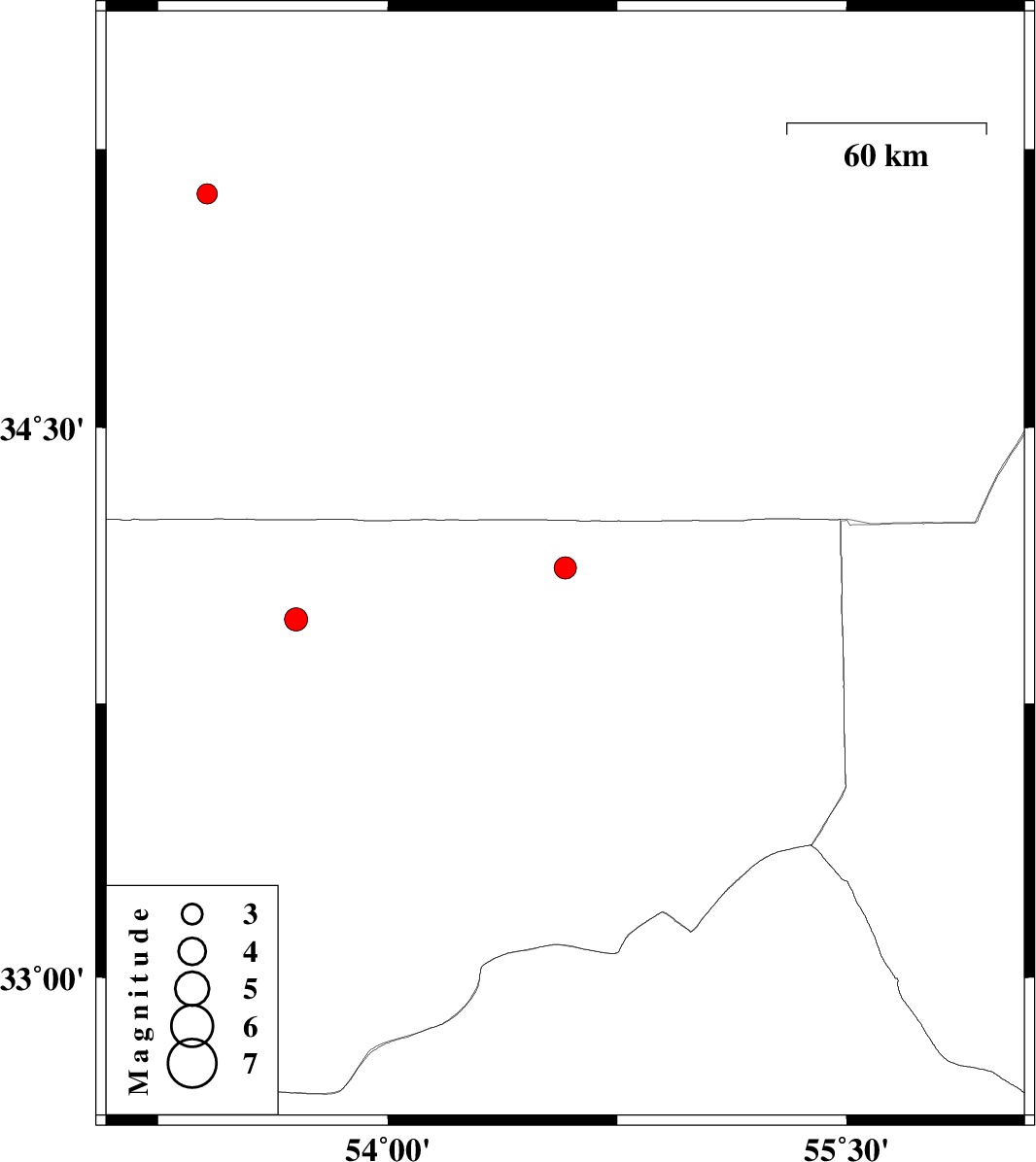 | 2013/09/24 | 06:14:25.2 | 09:44:25.2 | 34.12 | 54.58 | 15 | ML:3.3 | Esfahan Province, 229 km South-East of Damghan | ||
