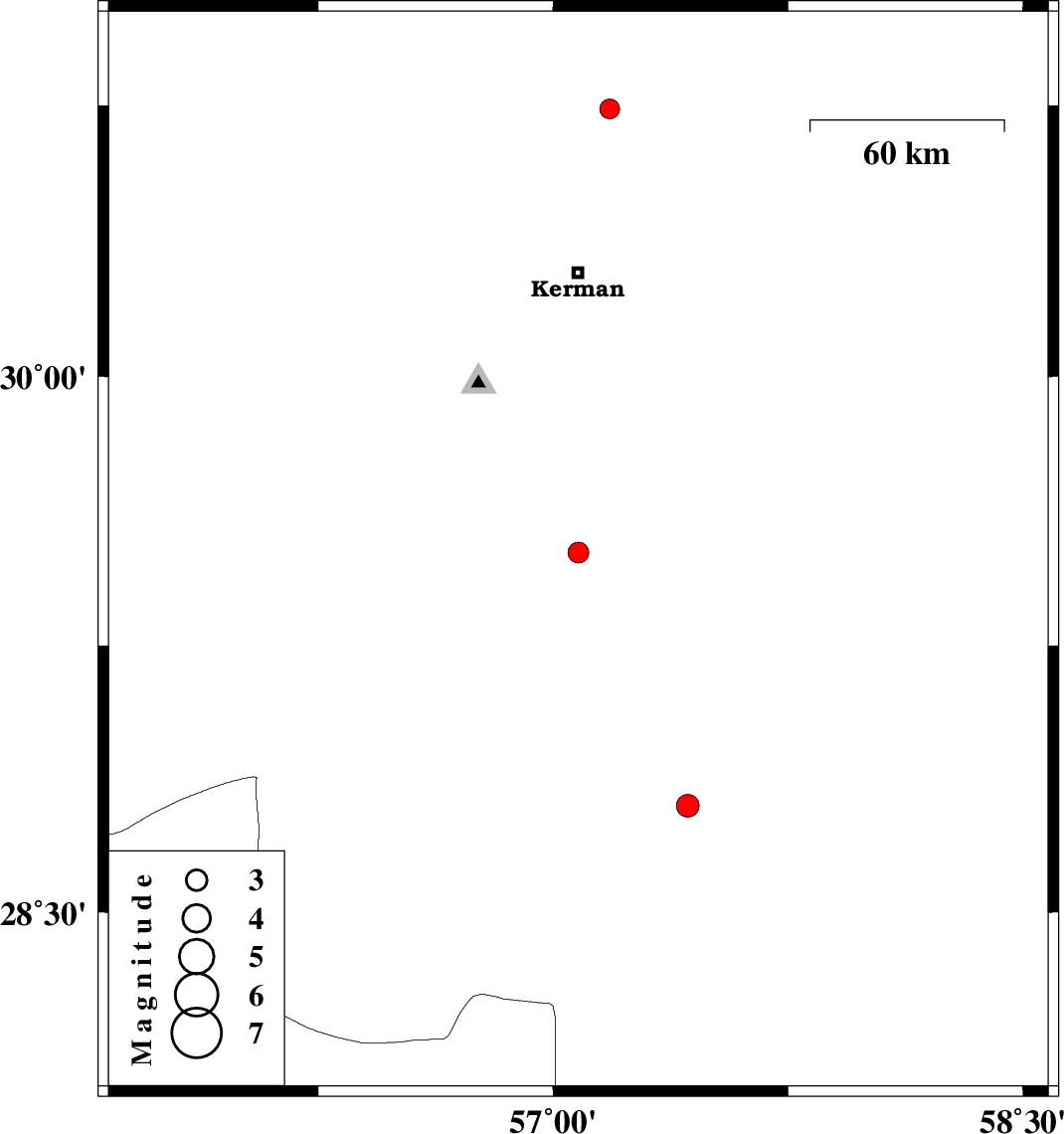 | 2013/09/24 | 04:43:26.9 | 08:13:26.9 | 28.8 | 57.43 | 15 | ML:3.2 | Kerman Province, 34 km North-West of Jiroft |