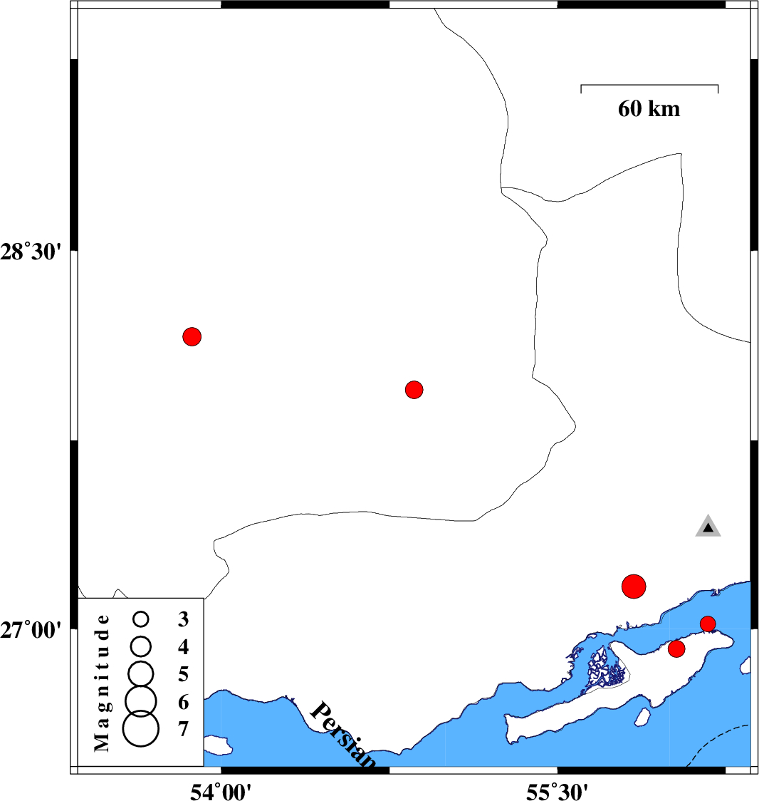 | 2013/09/17 | 16:19:41.3 | 20:49:41.3 | 26.92 | 56.03 | 15 | ML:3.4 | Persian Gulf, 24 km West of Qeshm |