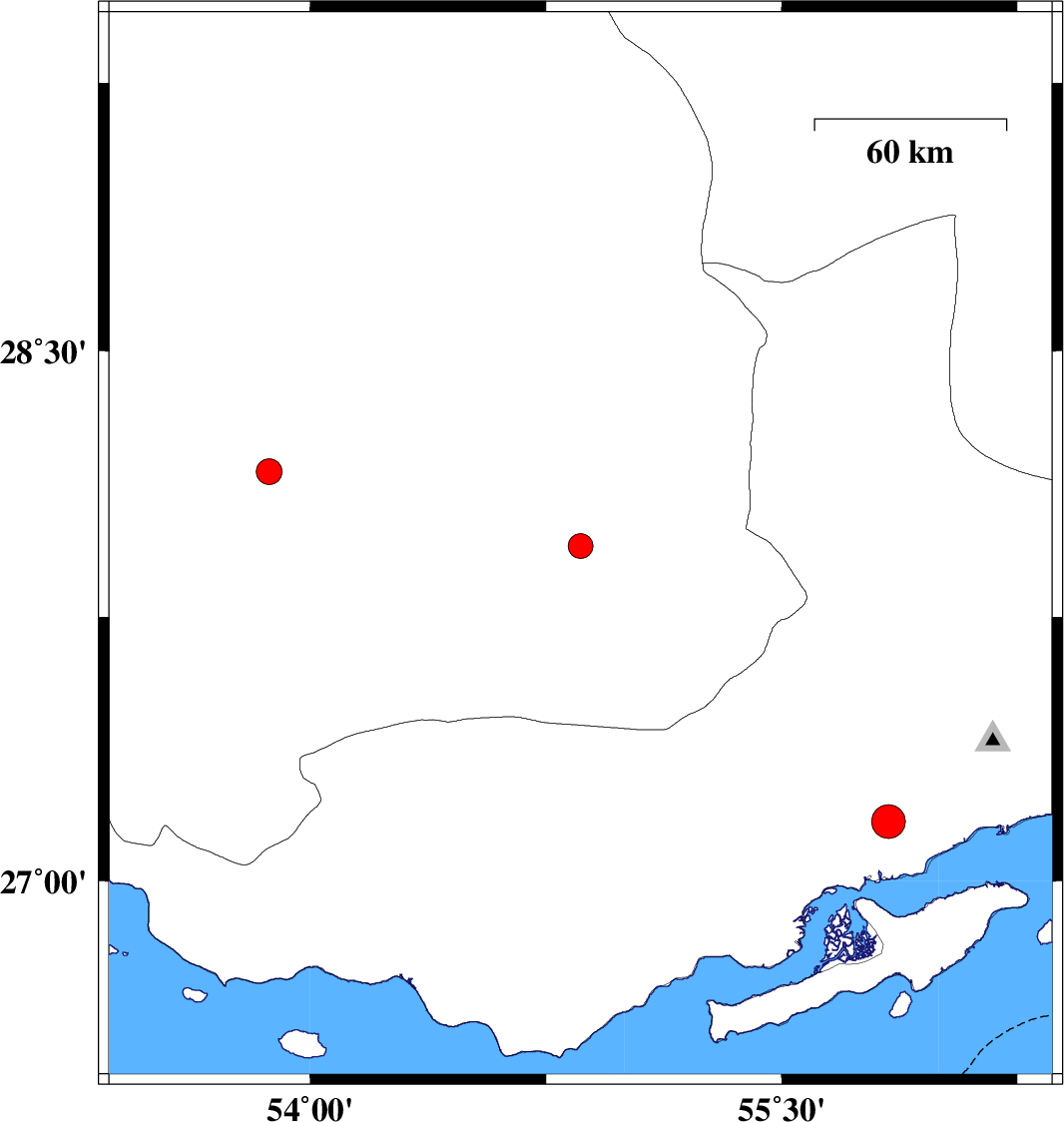 | 2013/10/12 | 08:18:18.1 | 11:48:18.1 | 27.95 | 54.86 | 14 | ML:3.5 | Fars Province, 59 km North-East of Lar | ||