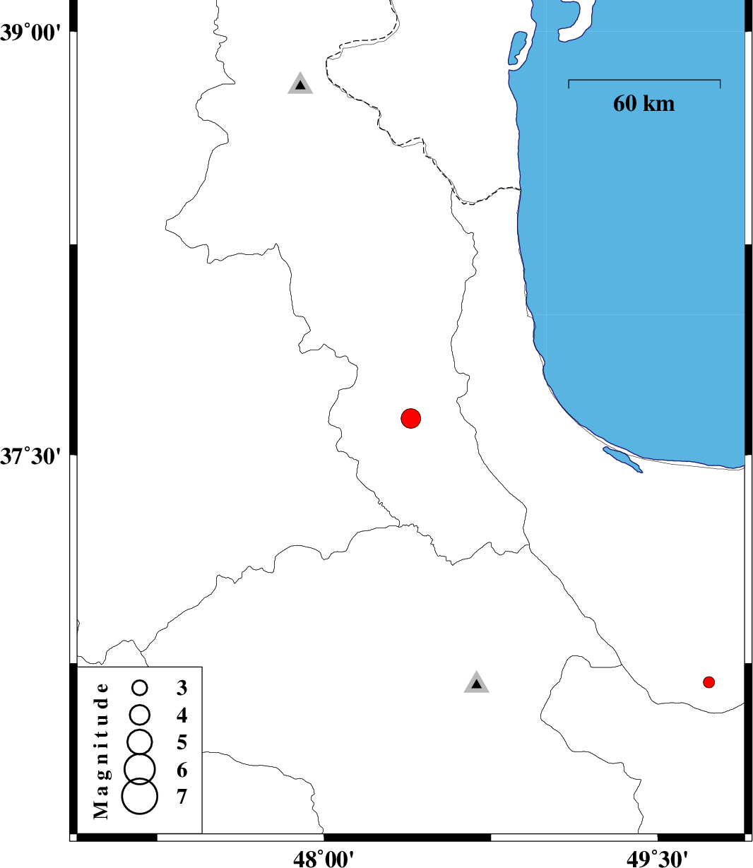| 2013/10/13 | 22:21:54.7 | 01:51:54.7 | 37.63 | 48.39 | 14 | ML:3.9 | Ardebil Province, 7 km Givi | ||