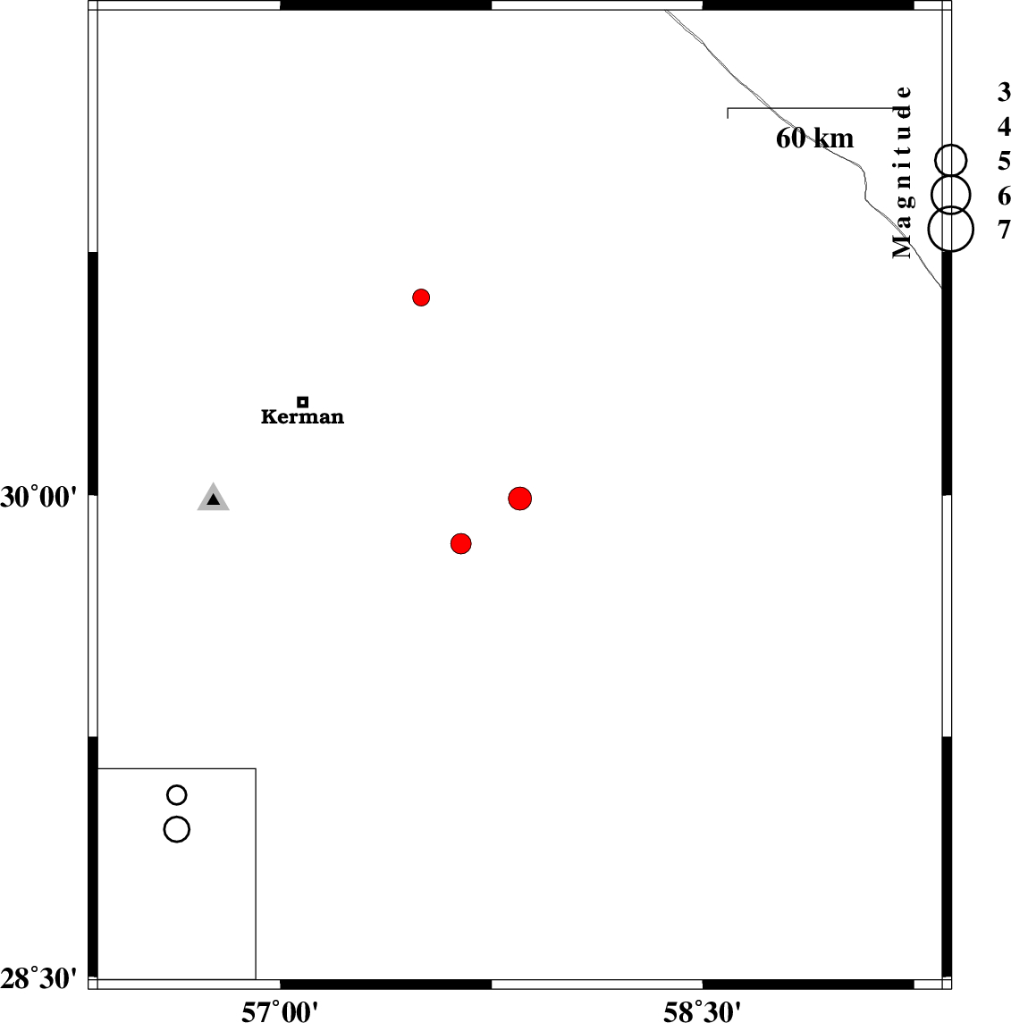 | 2013/10/12 | 00:33:48.1 | 04:03:48.1 | 29.85 | 57.64 | 30 | ML:3.3 | Kerman Province, 73 km South-East of Kerman | ||
