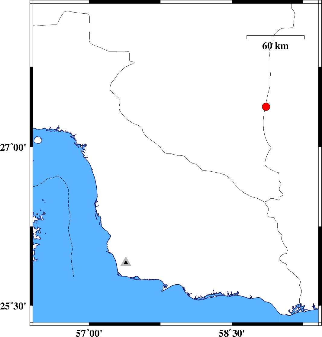 | 2013/10/15 | 12:52:18.8 | 16:22:18.8 | 28.3 | 57.3 | 14 | ML:3.6 | Kerman Province, 55 km North-West of Kahnuj |