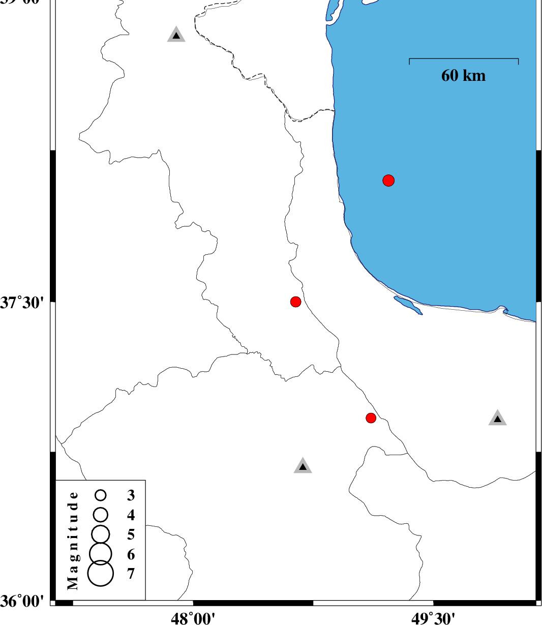 | 2013/10/21 | 23:28:38.2 | 02:58:38.2 | 38.1 | 49.22 | 15 | ML:3.3 | Caspian Sea, 44 km North-East of Hashtpar |