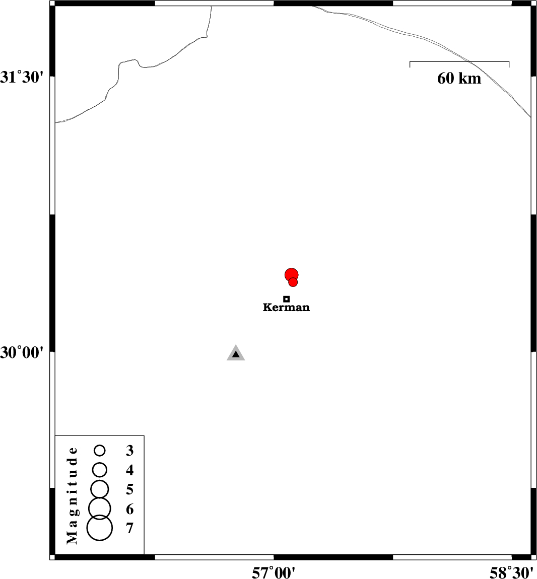 | 2013/11/12 | 02:27:23.4 | 05:57:23.4 | 30.42 | 57.11 | 14 | ML:3.8 | Kerman Province, 15 km North of Kerman |