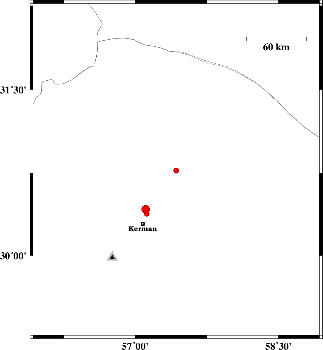 | 2013/11/12 | 02:27:23.4 | 05:57:23.4 | 30.42 | 57.11 | 14 | ML:3.8 | Kerman Province, 15 km North of Kerman |