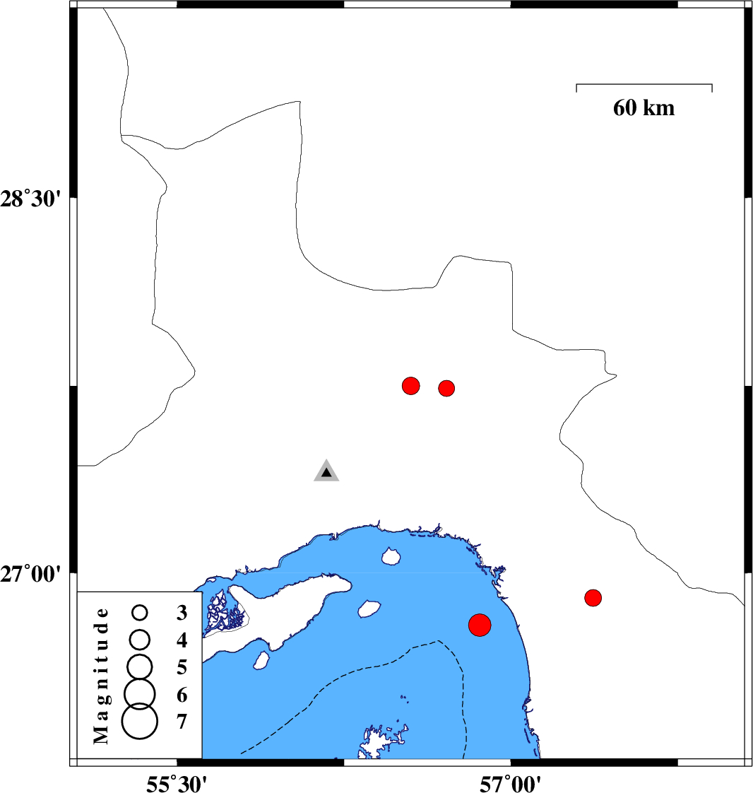 | 2013/11/27 | 07:25:40.5 | 10:55:40.5 | 26.79 | 56.86 | 8 | ML:4.5 | Oman Sea, 46 km South-West of Minab |