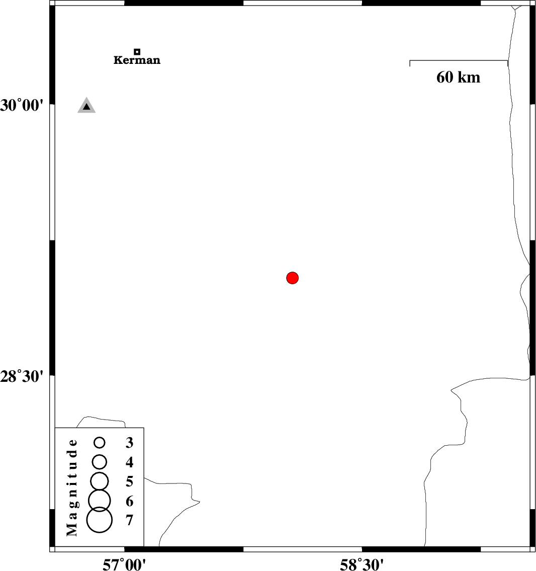 | 2013/12/05 | 11:28:50.1 | 14:58:50.1 | 29.04 | 58.06 | 15 | ML:3.4 | Kerman Province, 30 km West of Bam | ||
