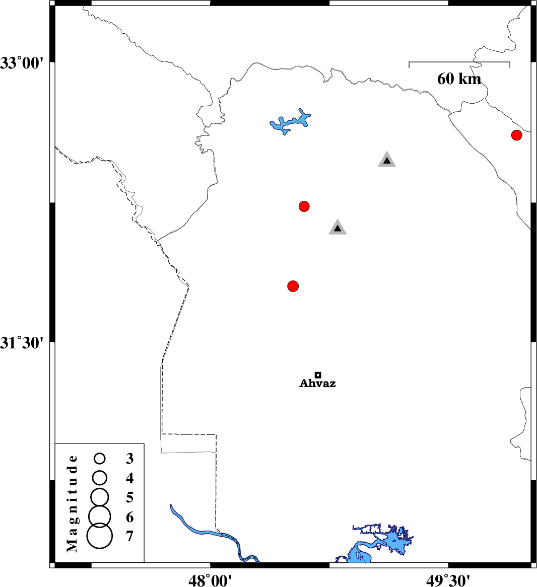 | 2013/12/10 | 15:26:55.2 | 18:56:55.2 | 31.8 | 48.52 | 14 | ML:3.1 | Khoozestan Province, 41 km South-West of Shushtar | ||