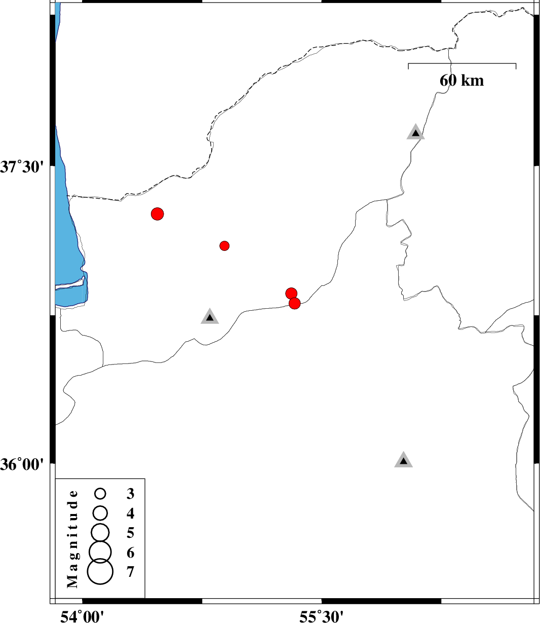 | 2013/11/14 | 12:23:00.7 | 15:53:00.7 | 37.26 | 54.47 | 15 | ML:3.5 | Golestan Province, 28 km North of Aq Qaleh |