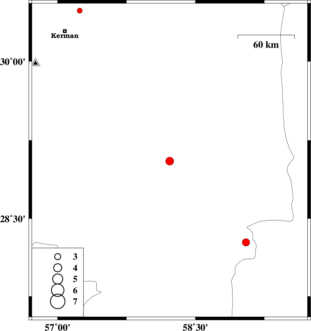 | 2013/12/17 | 20:07:40.9 | 23:37:40.9 | 29.05 | 58.22 | 15 | ML:3.9 | Kerman Province, 15 km West of Bam | ||