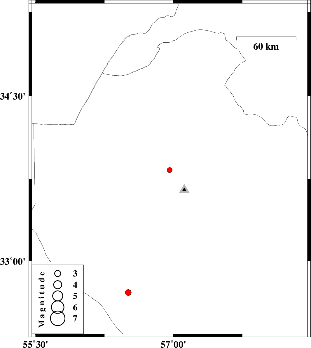 | 2013/12/15 | 06:28:37.9 | 09:58:37.9 | 32.71 | 56.51 | 16 | ML:2.9 | Yazd Province, 107 km South-West of Tabas |