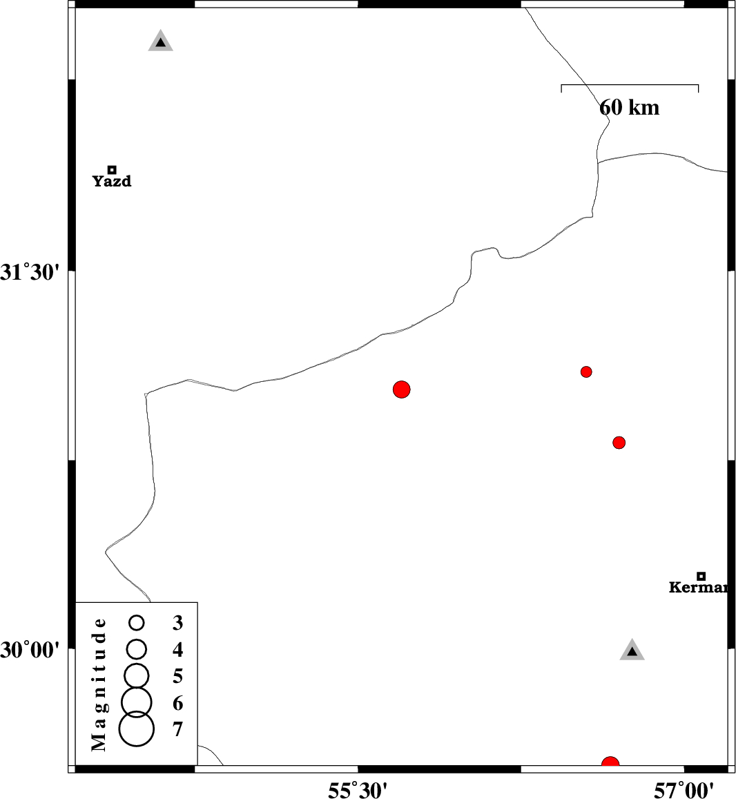 | 2014/01/13 | 06:32:02.1 | 10:02:02.1 | 31.03 | 55.7 | 14 | ML:3.5 | Kerman Province, 70 km South-East of Bafq | ||