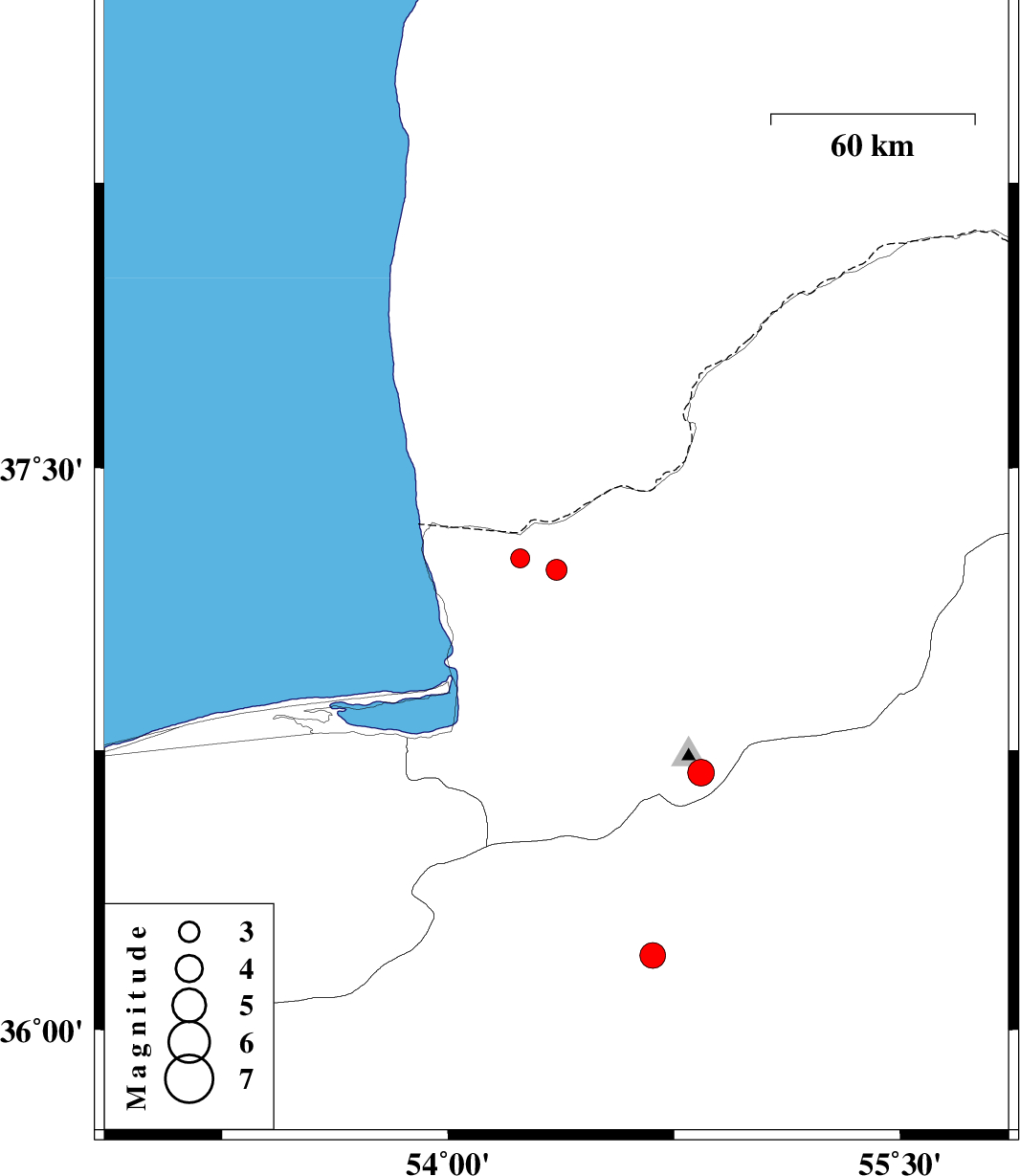| 2014/01/20 | 09:58:15.5 | 13:28:15.5 | 36.69 | 54.84 | 14 | ML:3.9 | Golestan Province, 25 km South of Ali Abad |