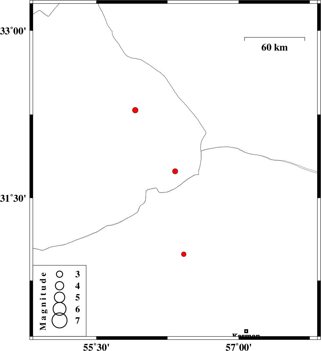 | 2014/01/23 | 05:43:45.4 | 09:13:45.4 | 32.29 | 55.91 | 18 | ML:2.7 | Yazd Province, 90 km North-East of Bafq |