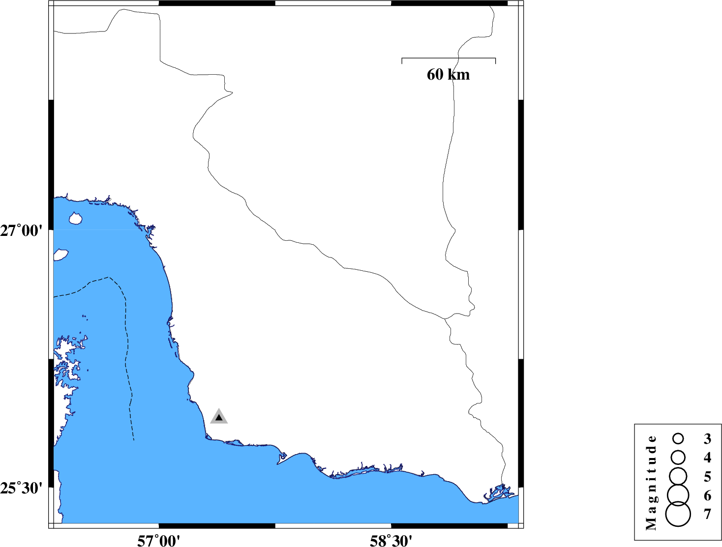 | 2014/02/02 | 14:26:44.5 | 17:56:44.5 | 26.79 | 57.82 | 15 | Mb:5.3 | Hormozgan Province, 76 km South-East of Manujan | ||