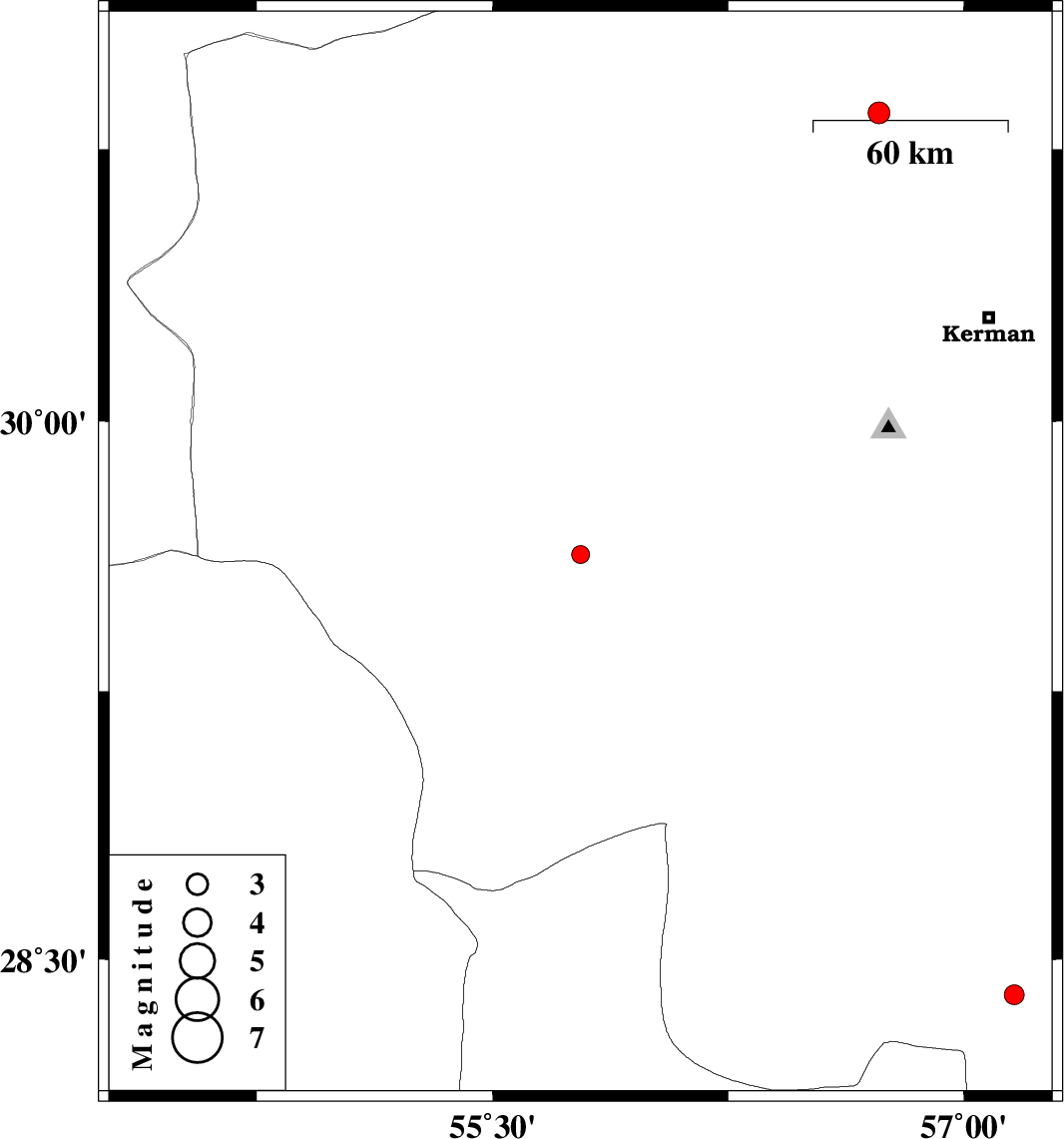 | 2014/02/06 | 11:28:54.5 | 14:58:54.5 | 28.4 | 57.16 | 14 | ML:2.8 | Kerman Province, 64 km South-West of Jiroft | ||