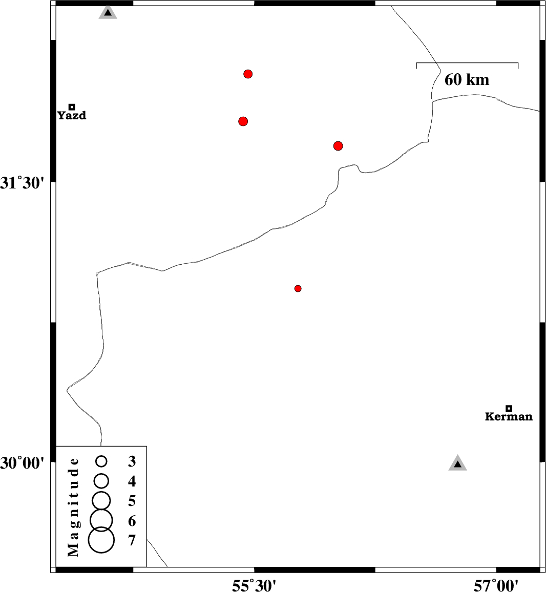 | 2014/02/23 | 13:42:09.7 | 17:12:09.7 | 31.82 | 55.43 | 15 | ML:2.5 | Yazd Province, 24 km North of Bafq | ||