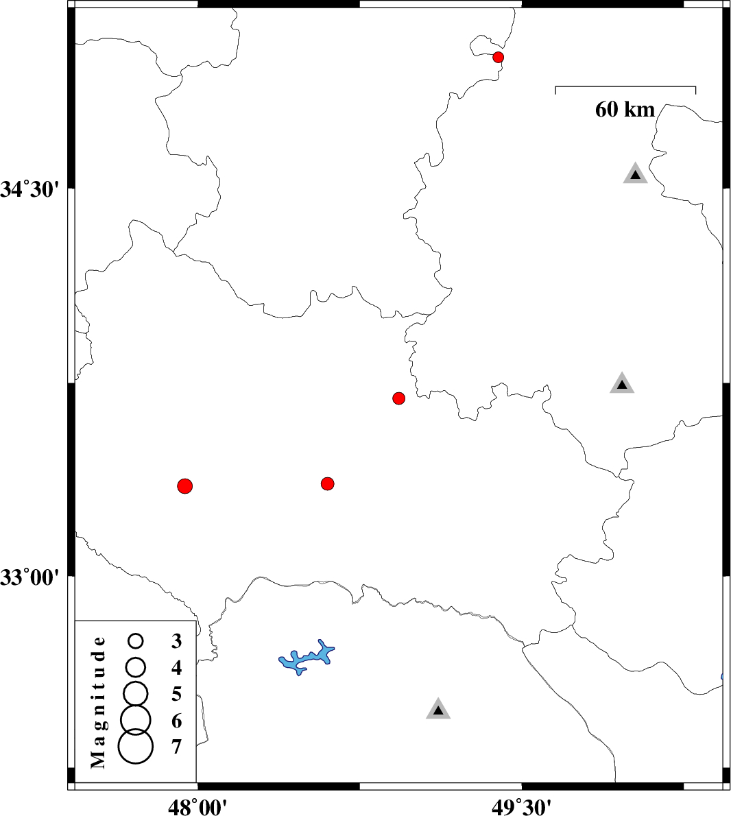 | 2014/03/02 | 05:50:20.6 | 09:20:20.6 | 33.69 | 48.93 | 15 | ML:2.6 | Lorestan Province, 27 km North-West of Dorud | ||
