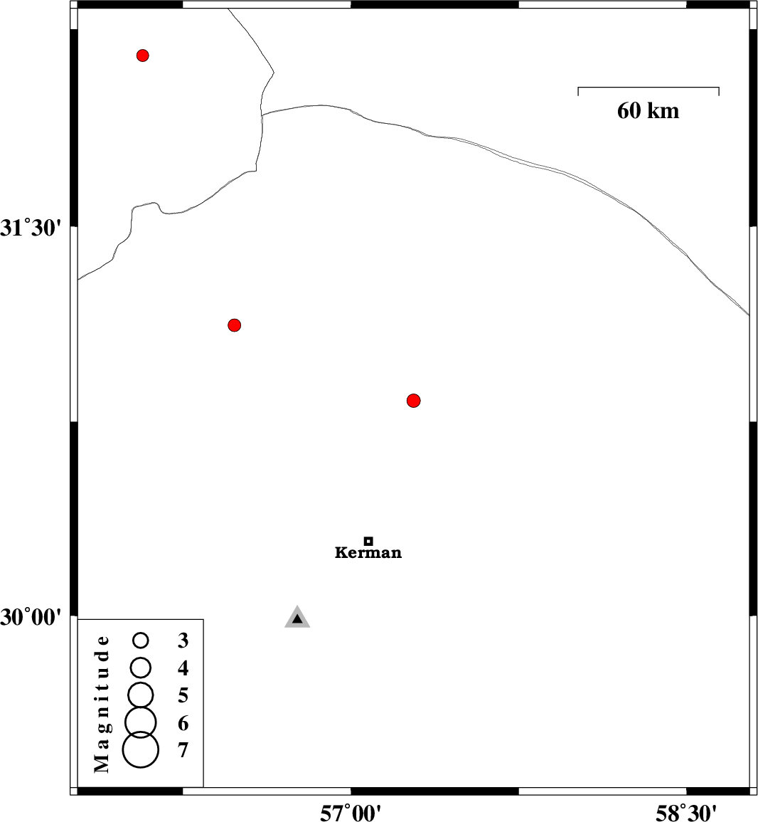 | 2014/03/06 | 20:13:53.6 | 23:43:53.6 | 32.15 | 56.07 | 15 | ML:2.4 | Yazd Province, 88 km North-East of Bafq |