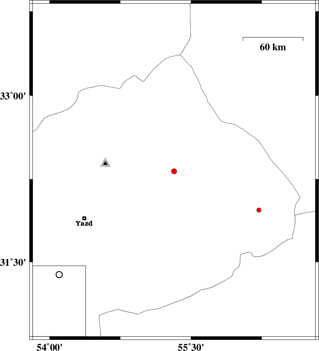 | 2014/04/15 | 02:04:59.9 | 06:34:59.9 | 31.97 | 56.22 | 34 | ML:2.1 | Yazd Province, 88 km North-East of Bafq |