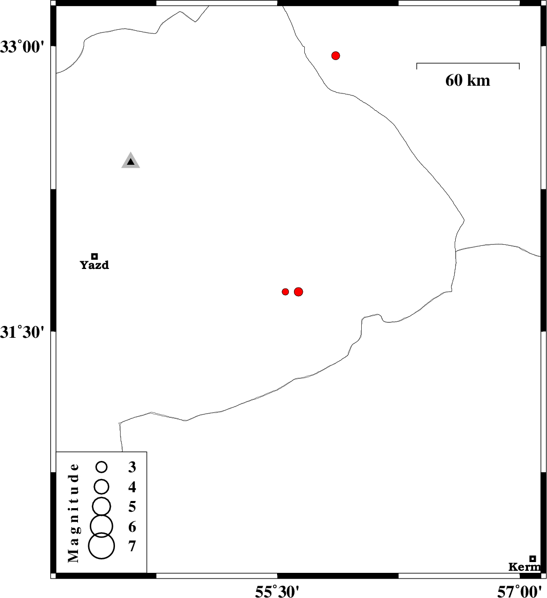 | 2014/05/11 | 09:50:15.9 | 14:20:15.9 | 31.71 | 55.63 | 14 | ML:2.4 | Yazd Province, 25 km North-East of Bafq | ||