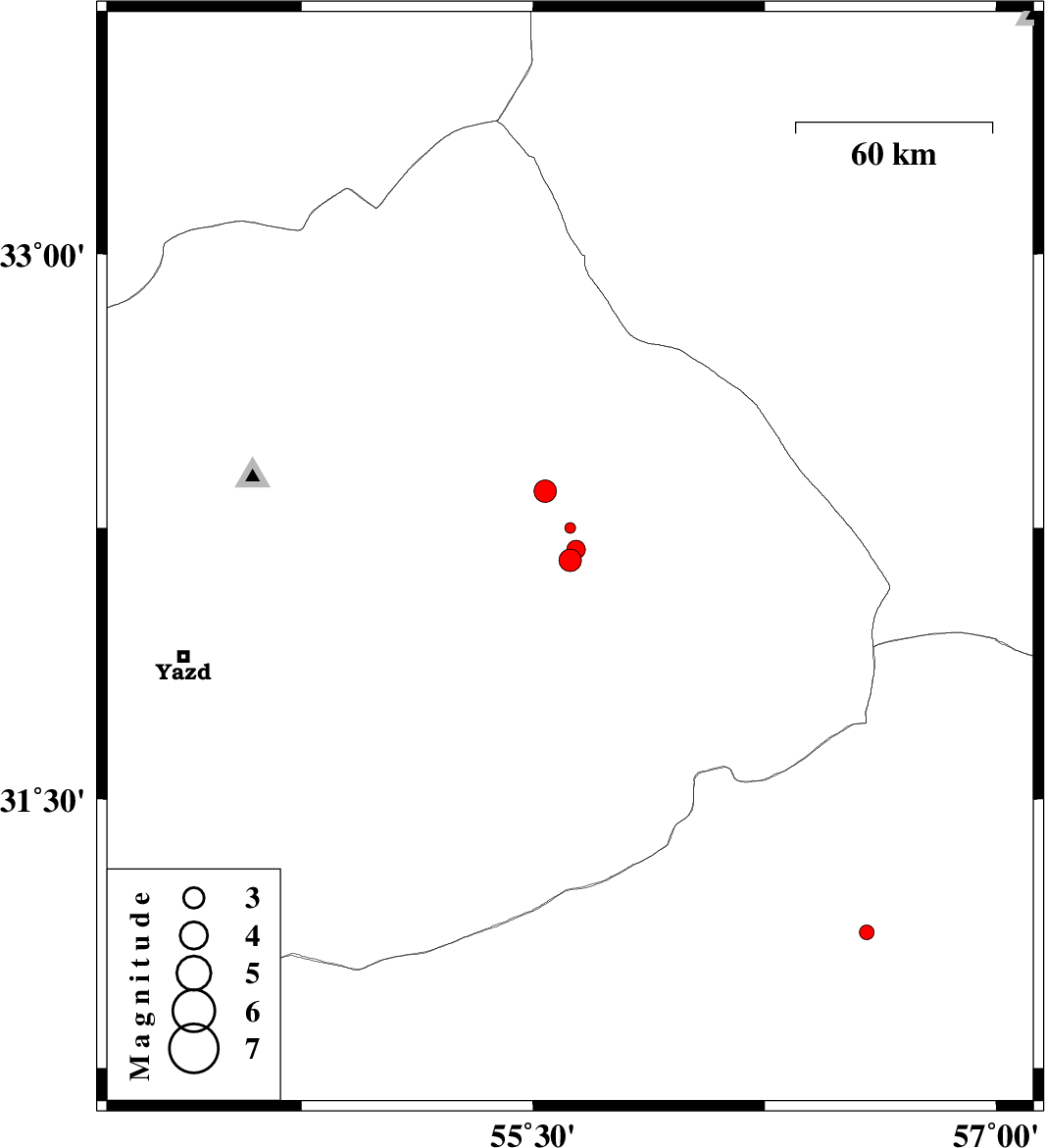 | 2014/05/16 | 02:10:15.2 | 06:40:15.2 | 32.25 | 55.62 | 14 | ML:1.6 | Yazd Province, 75 km North-East of Bafq |