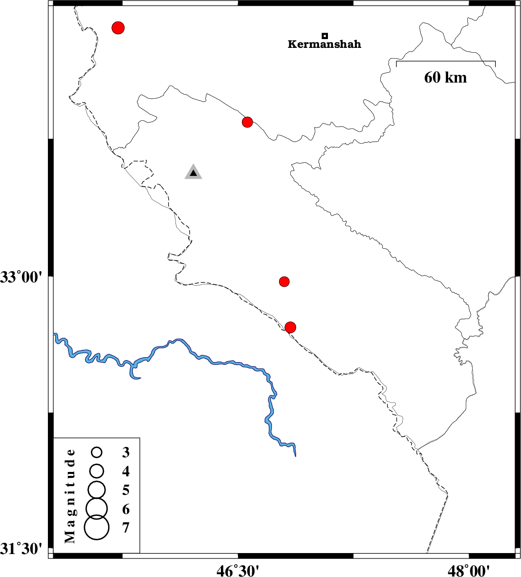 | 2014/06/05 | 17:04:53.6 | 21:34:53.6 | 32.97 | 46.8 | 18 | ML:2.9 | Ilam Province, 50 km South-West of Darreh Shahr | ||